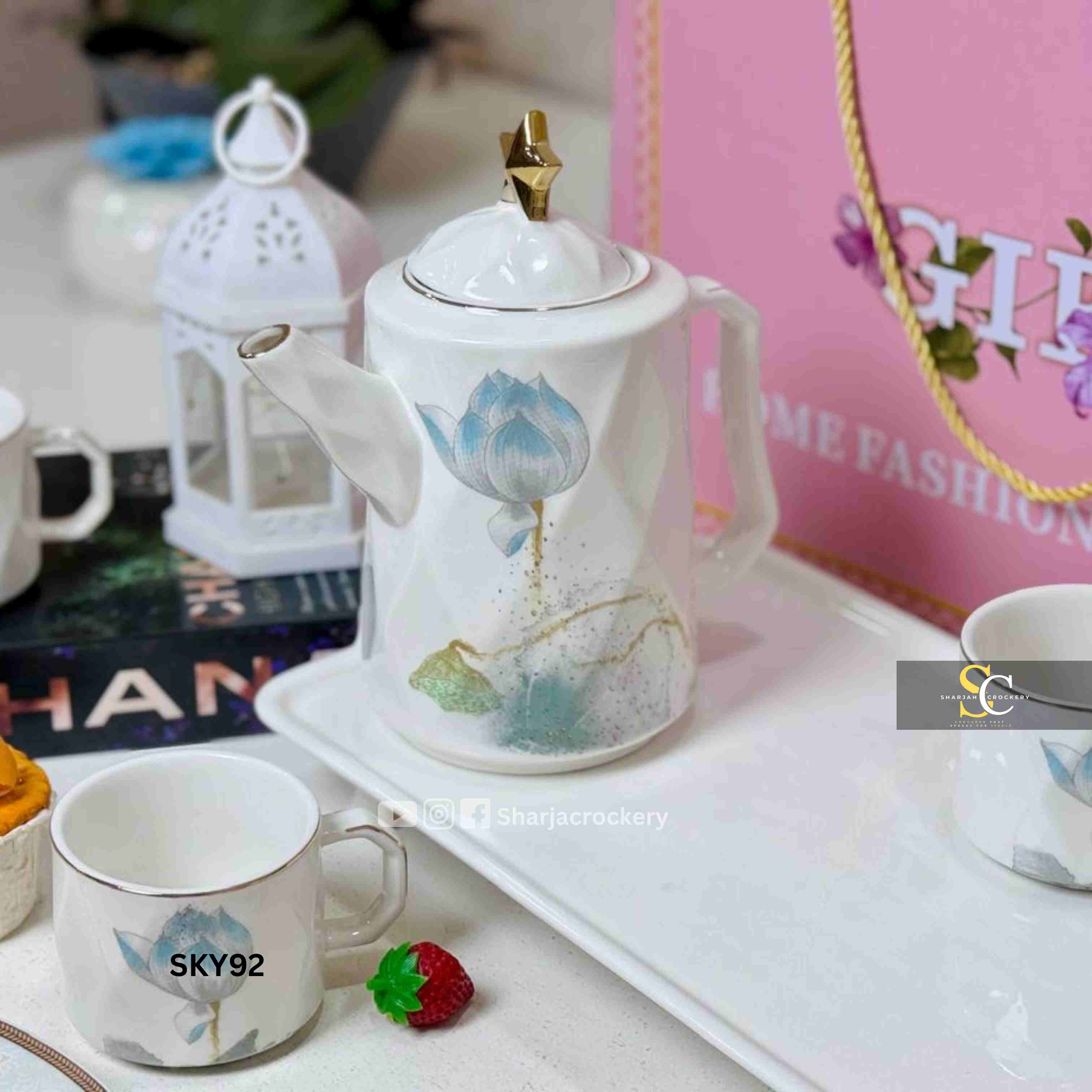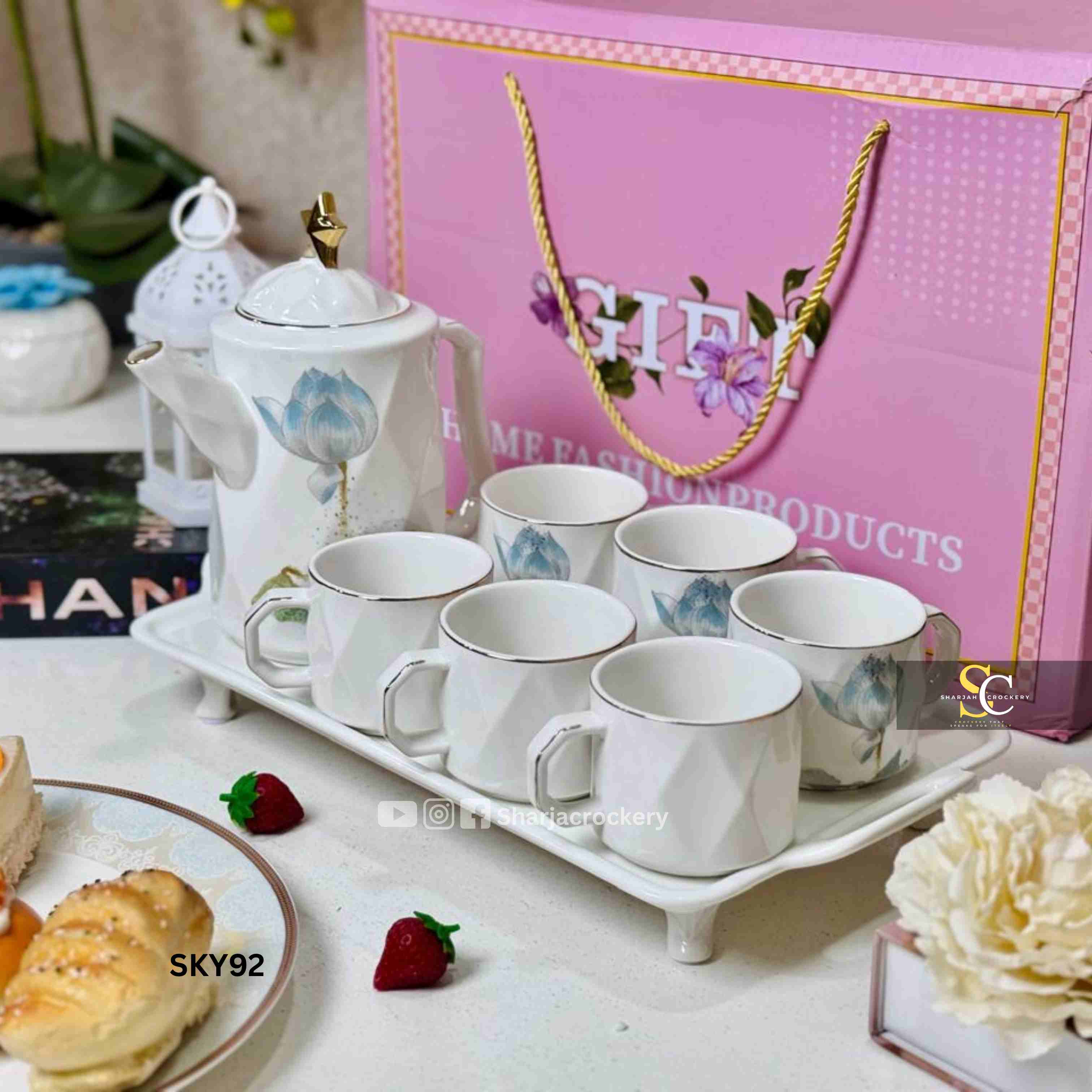 Modern Geometric White & Blue Floral 8-Piece Tea/Coffee Set - Teapot, 6 Mugs & Tray