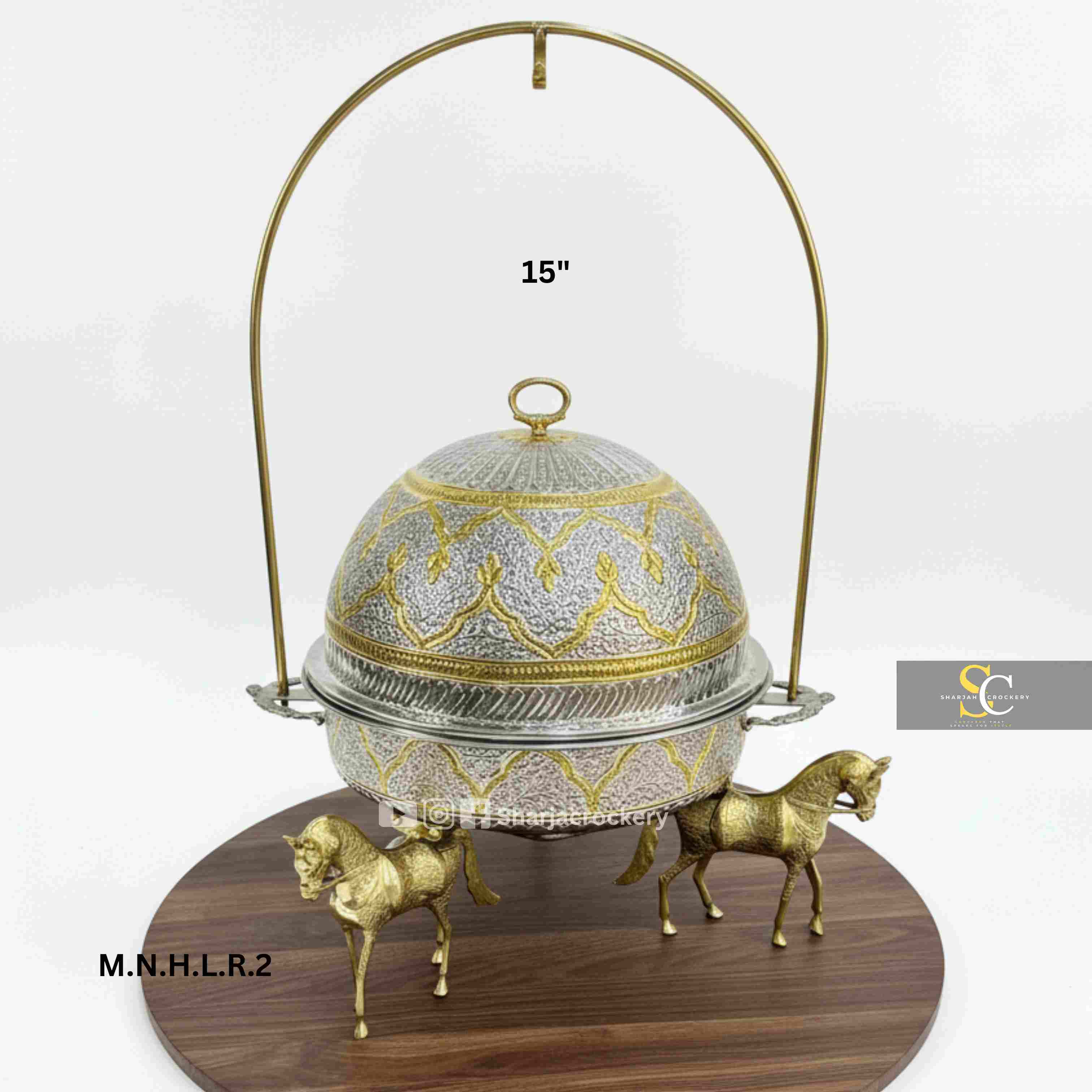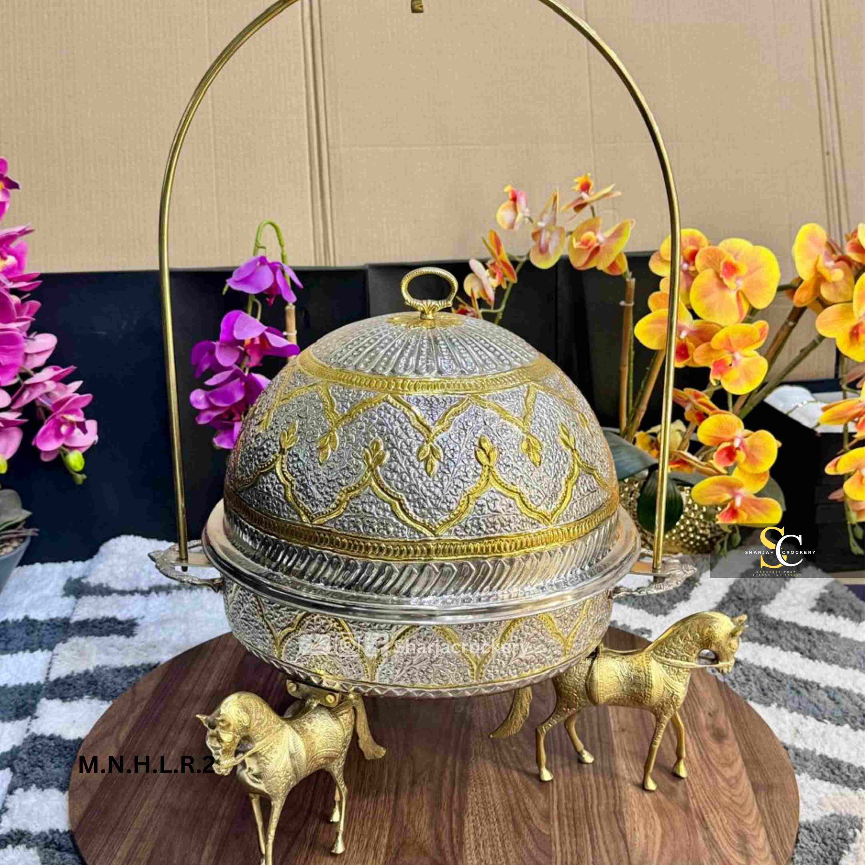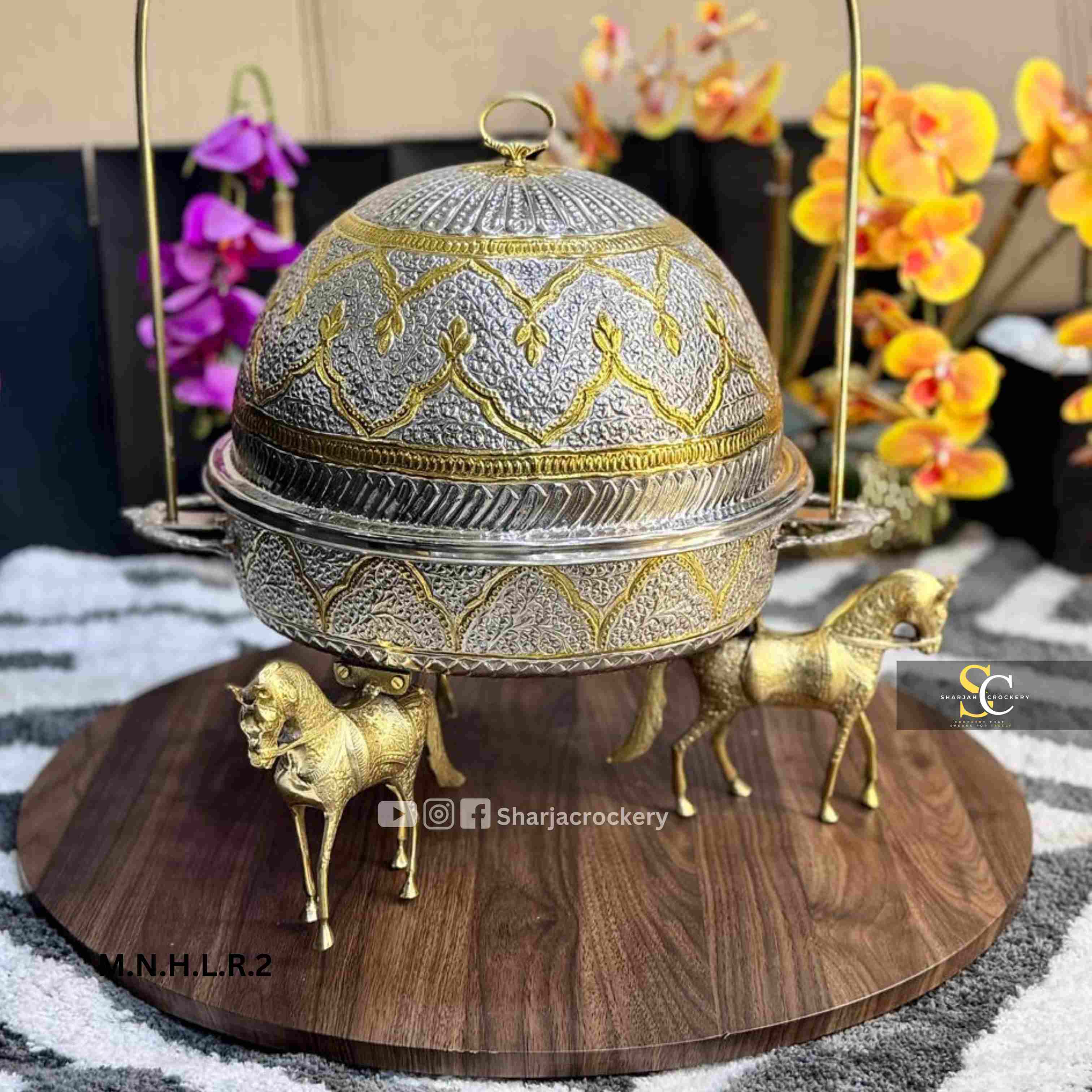 Command attention at your next dinner party or event with this breathtaking Royal Horse Stand Domed Serving Dish. This piece is the ultimate fusion of artistic craftsmanship and functional serving ware, designed to keep your main courses, biryanis, or specialty dishes warm while making an unforgettable presentation.