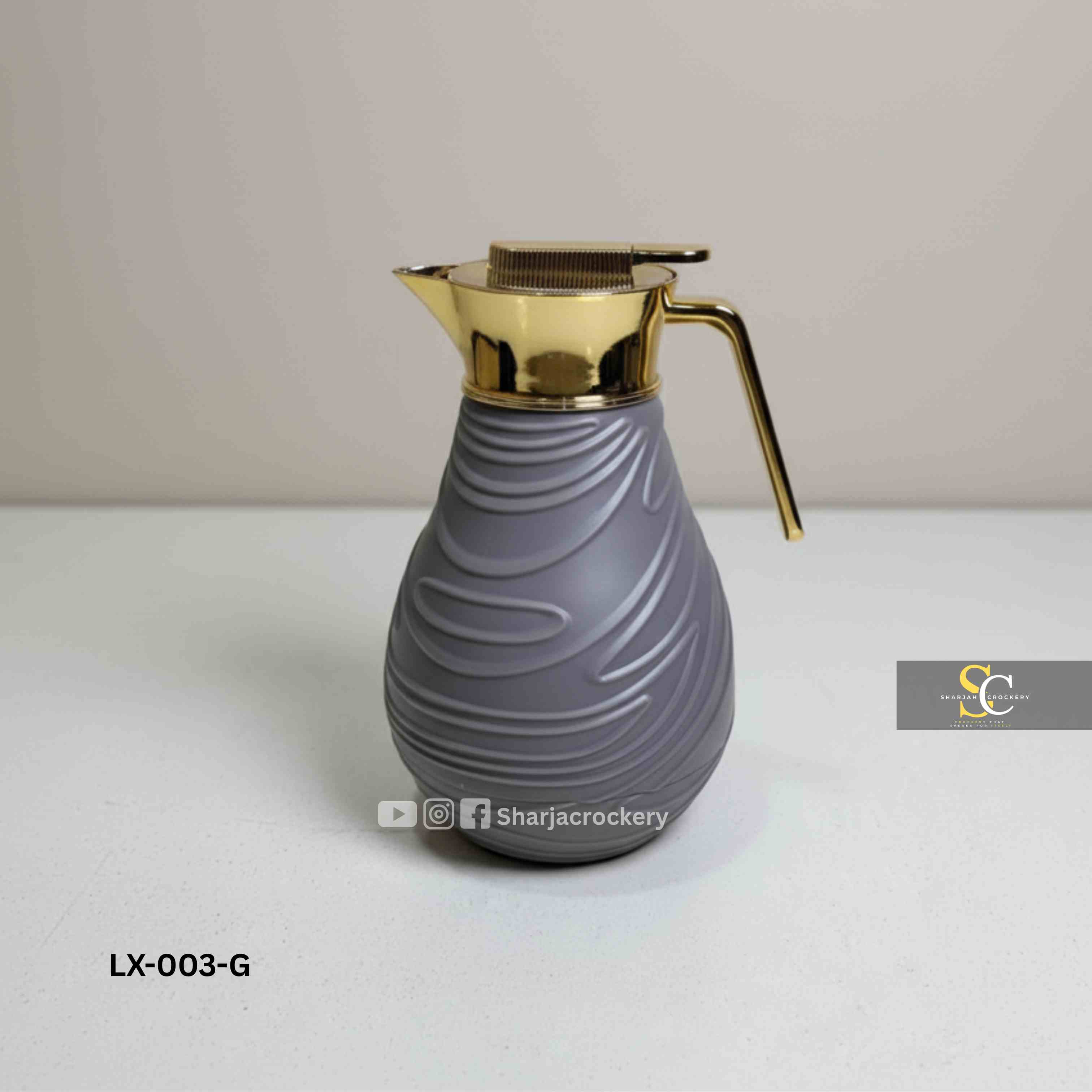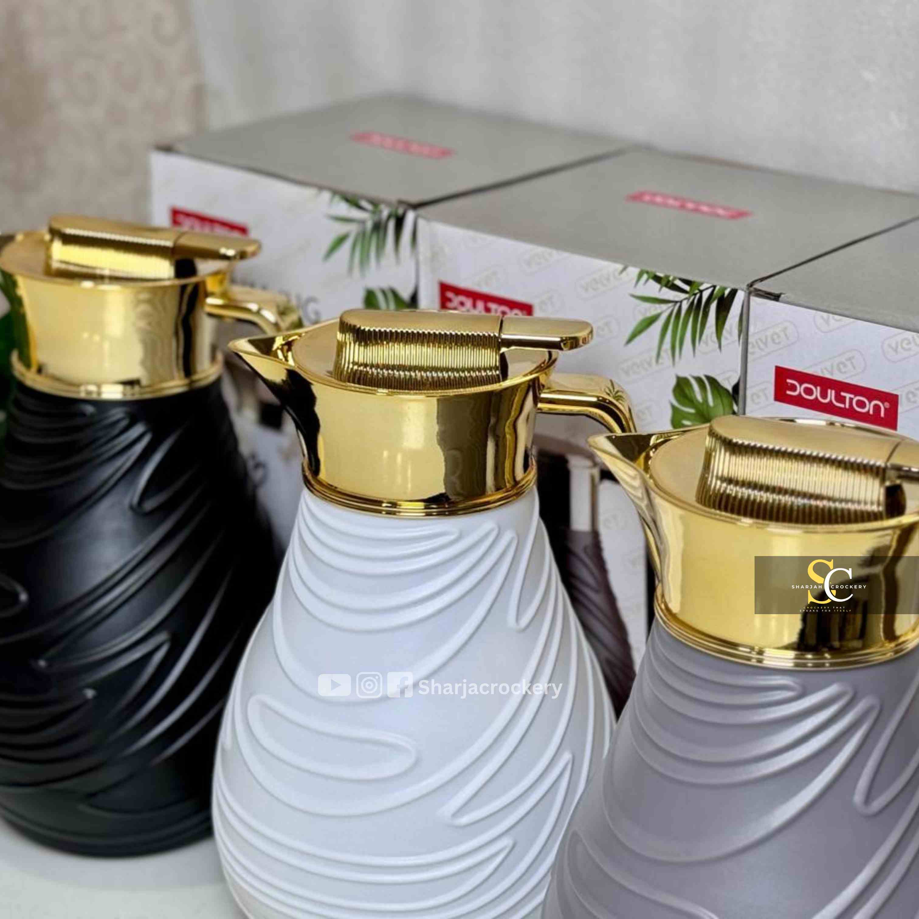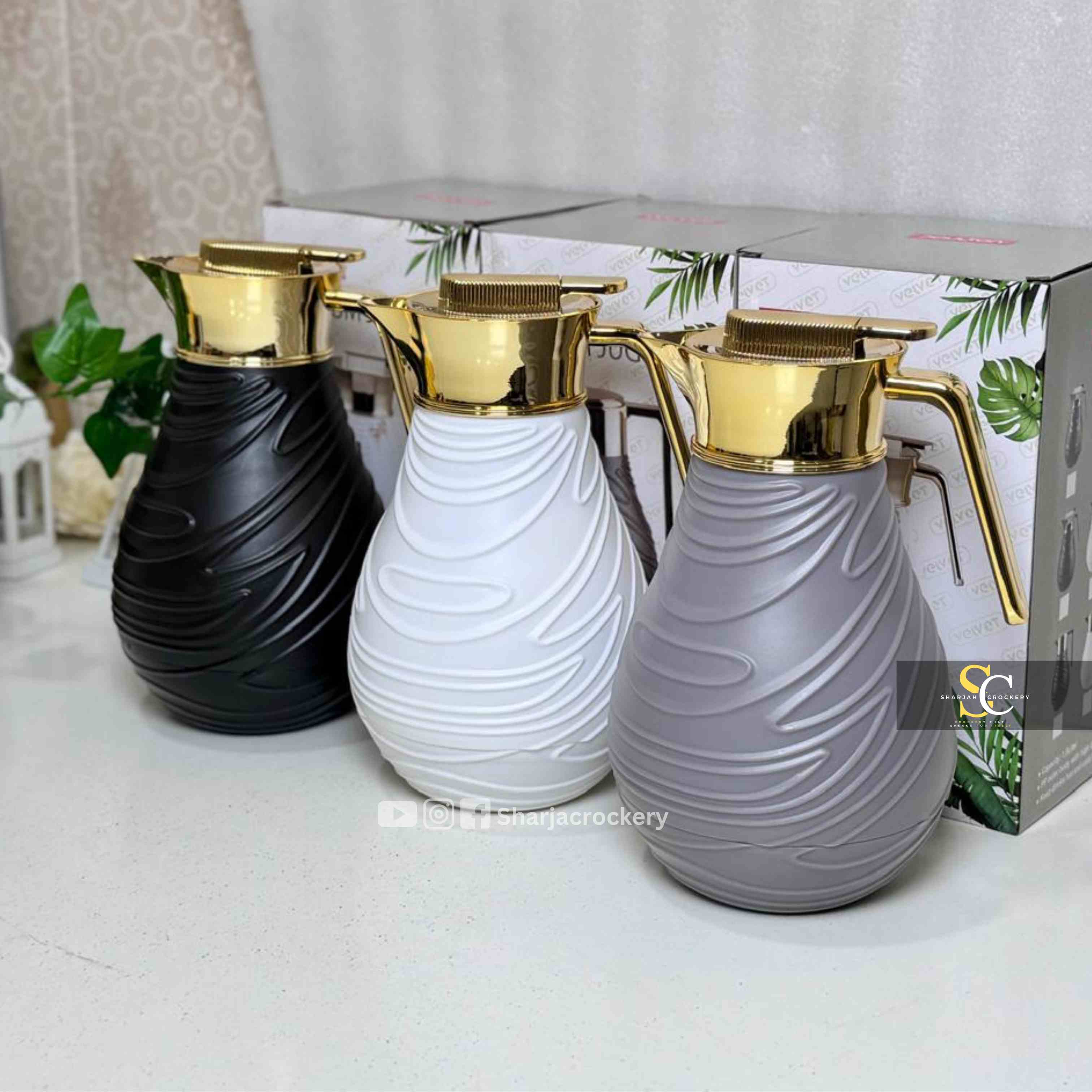 This insulated thermos (also known as flask) comes in three elegant colors – Black, White, and Grey. Its modern swirl texture, paired with a luxurious golden lid and handle, makes it not only functional but also stylish for any setting.