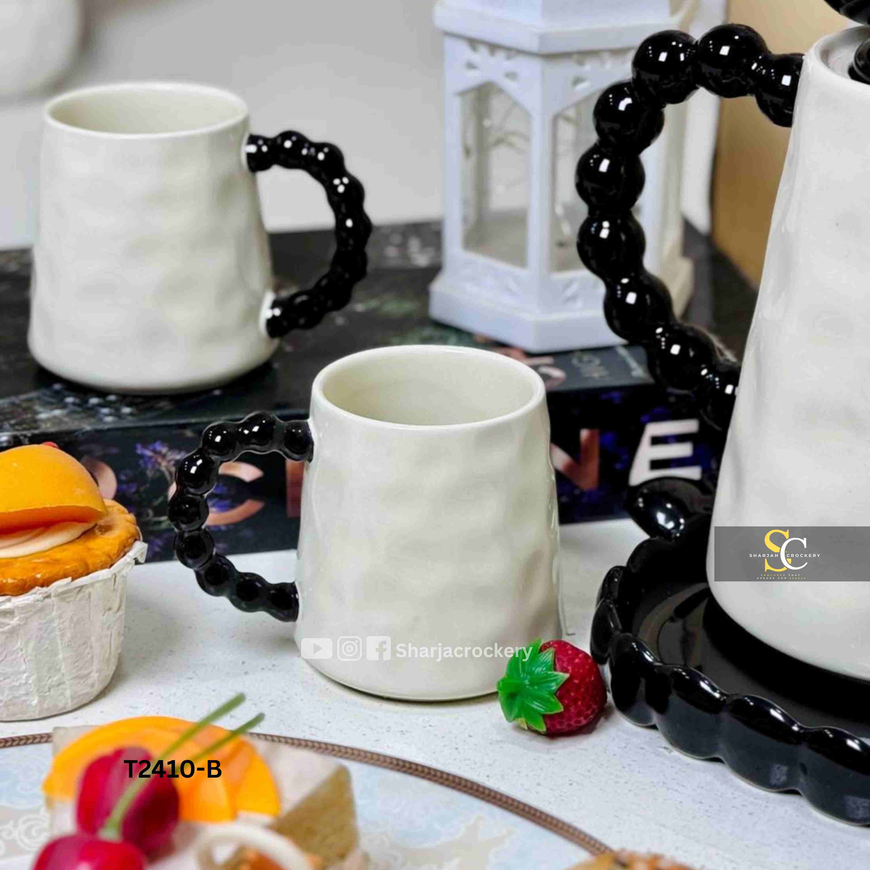 Textured Beaded Handles: Each mug boasts an innovative black beaded handle, providing a comfortable grip and a distinctive tactile experience.
