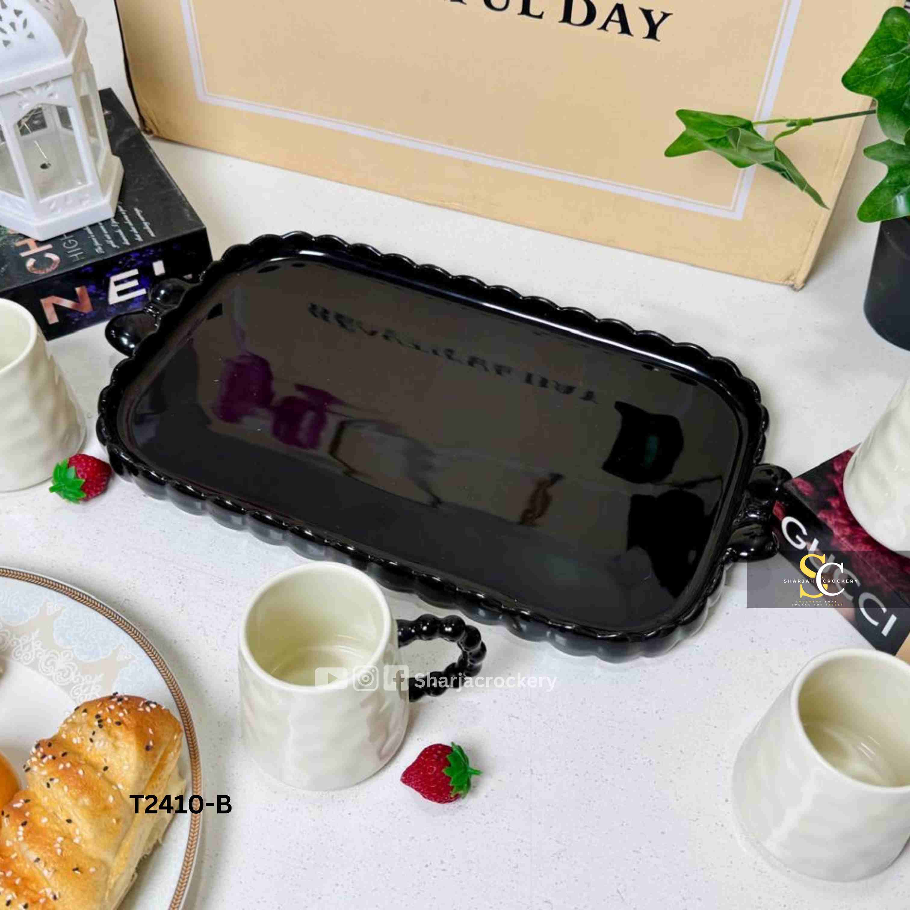 1 x Sleek Black Serving Tray with decorative scalloped edges.