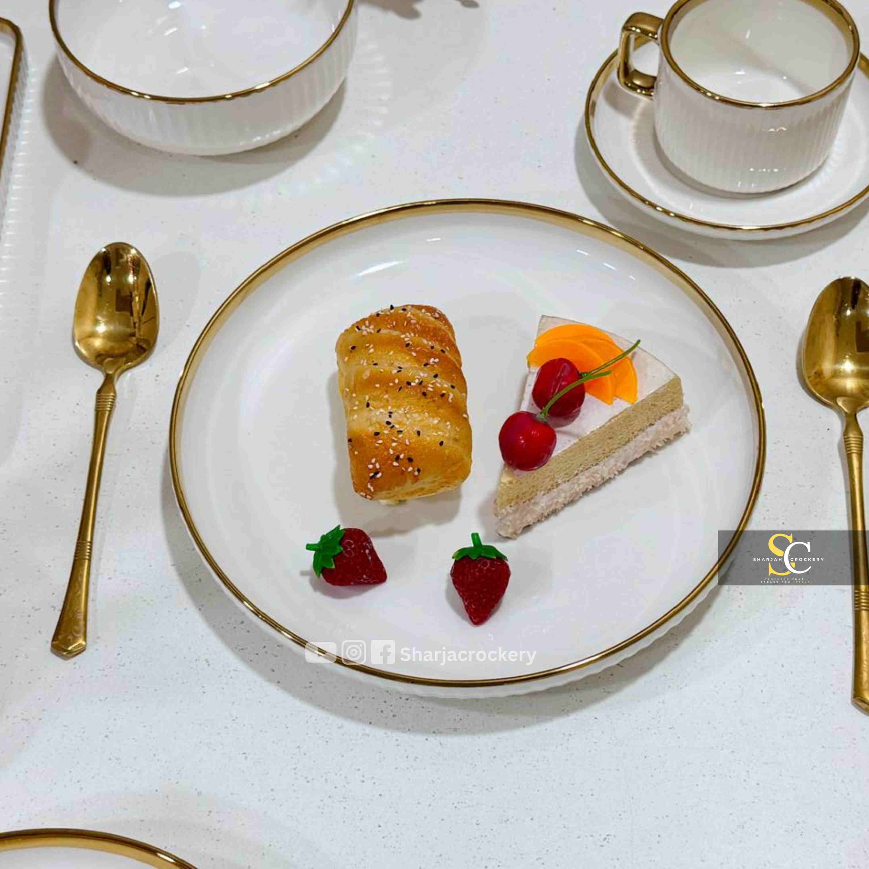 Crafted from high-quality porcelain, this dinner set combines durability with refined style. The clean white color and fine gold rim create a perfect blend of modern and classic design.