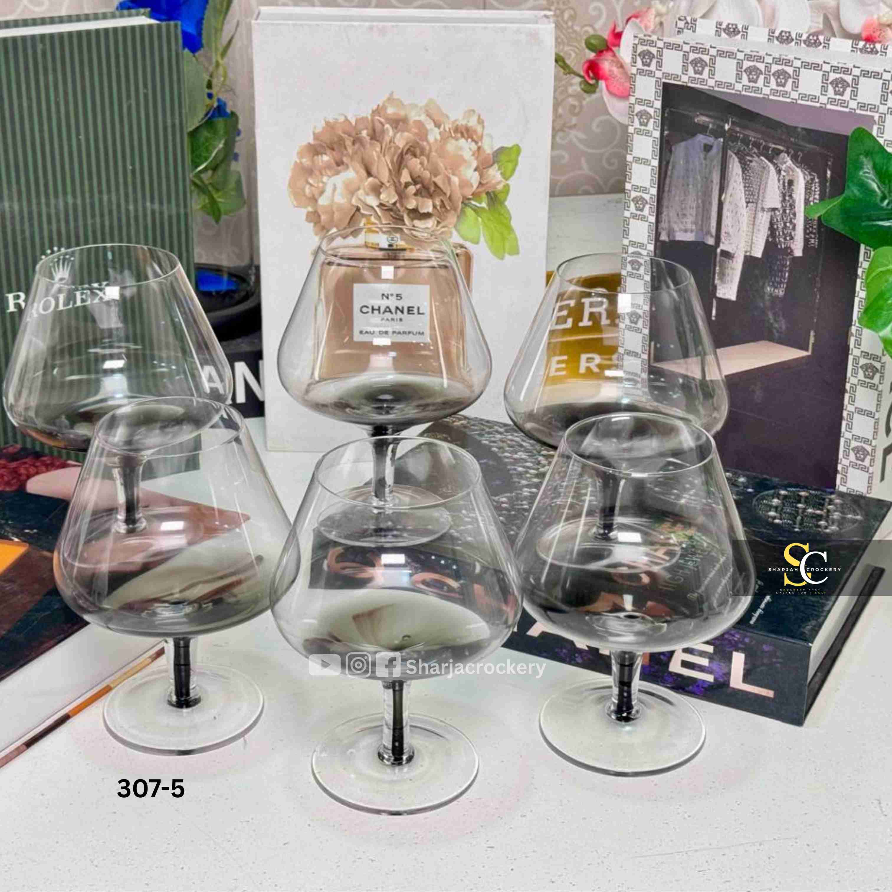 Add a touch of designer style to your home with this Modern Smokey Grey Goblet Set. This collection of six glasses features a unique, large bowl and a short stem with a sophisticated smokey grey/black tint. They are perfect for serving specialty cocktails, spirits, juice, or iced drinks.