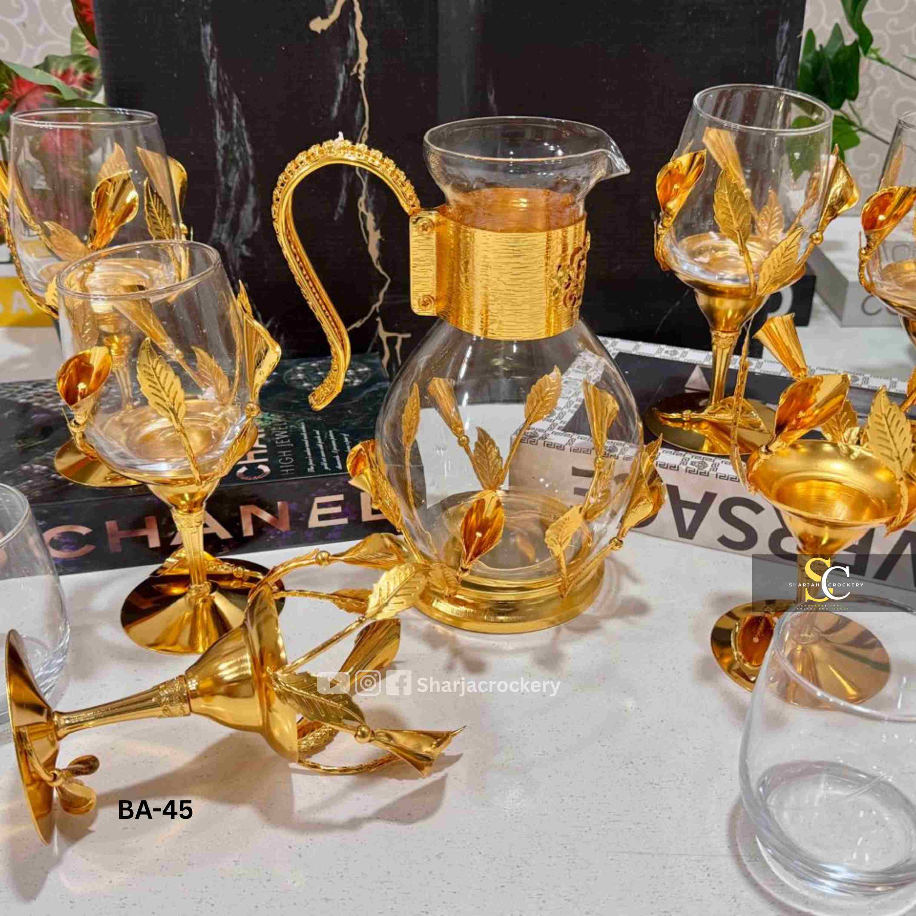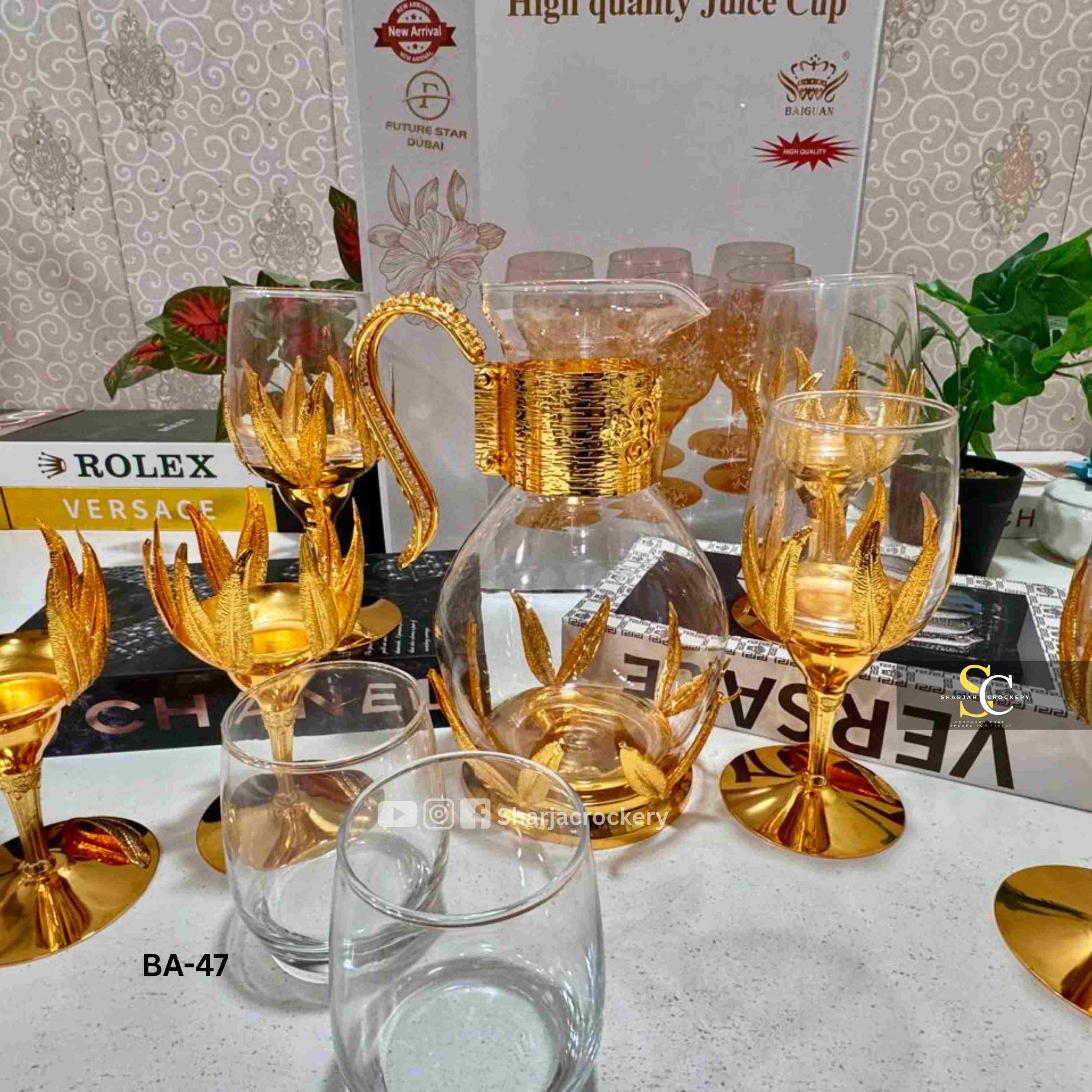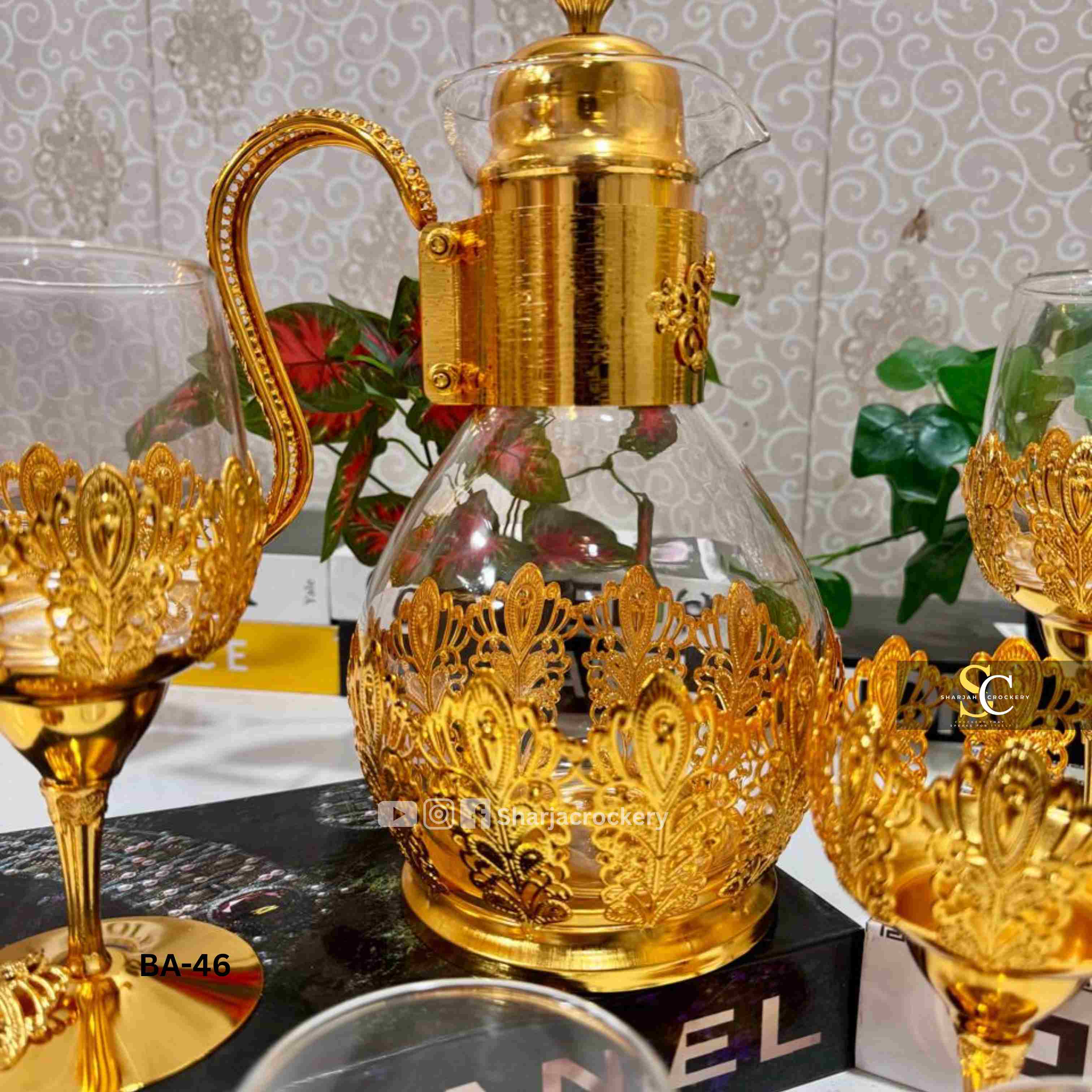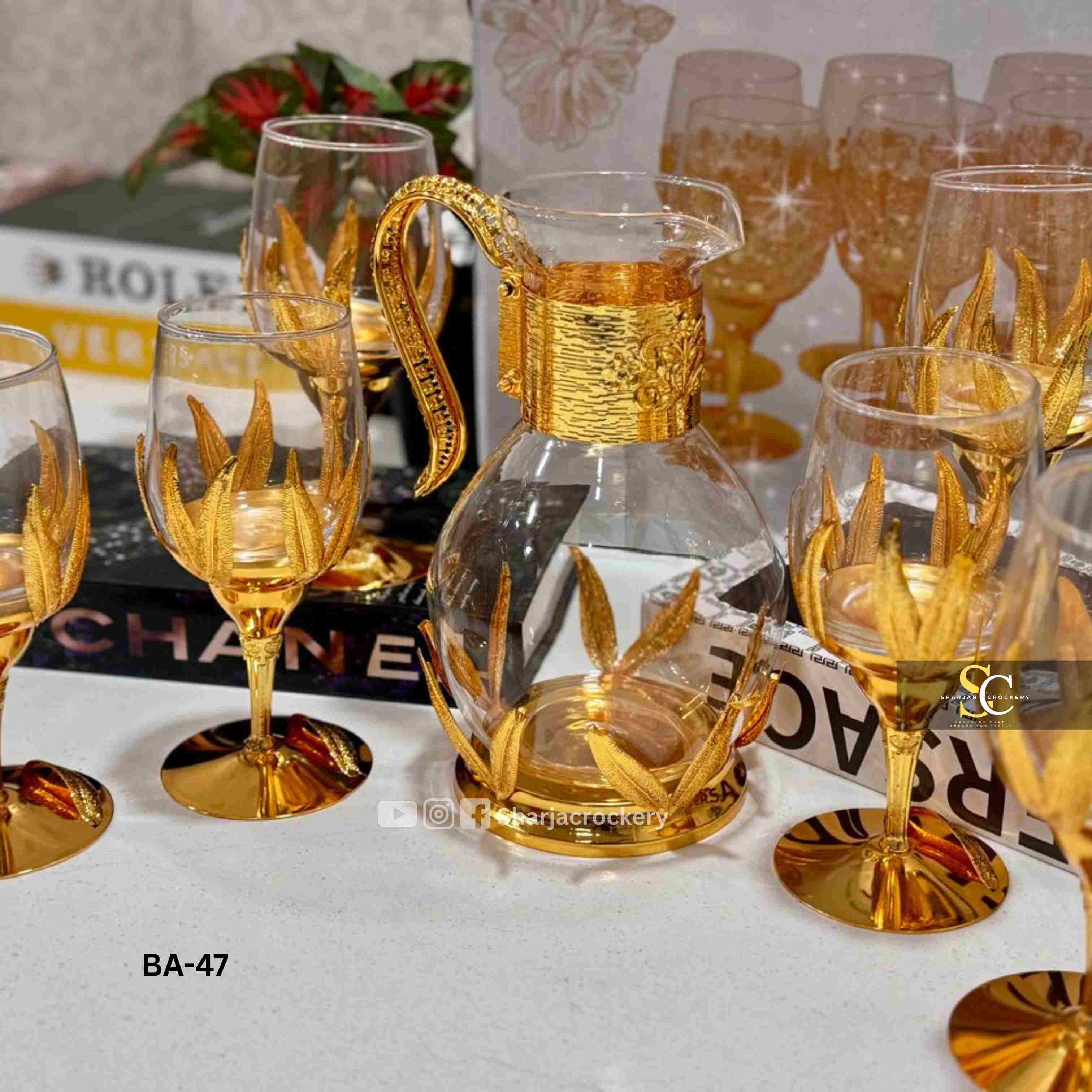 This premium collection features stunning, high-quality glass pitcher and glass sets (available in 7-piece and 9-piece configurations). Each set is lavishly adorned with opulent, intricate gold-plated designs, transforming simple serveware into a centerpiece of luxury.