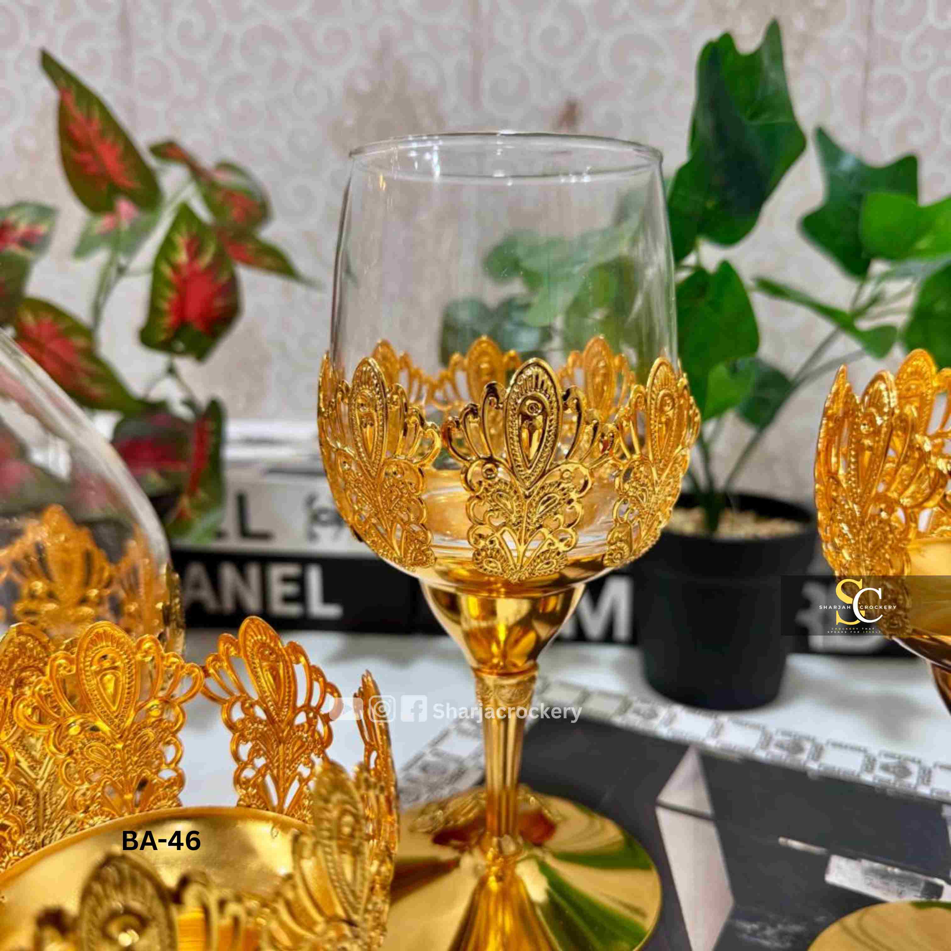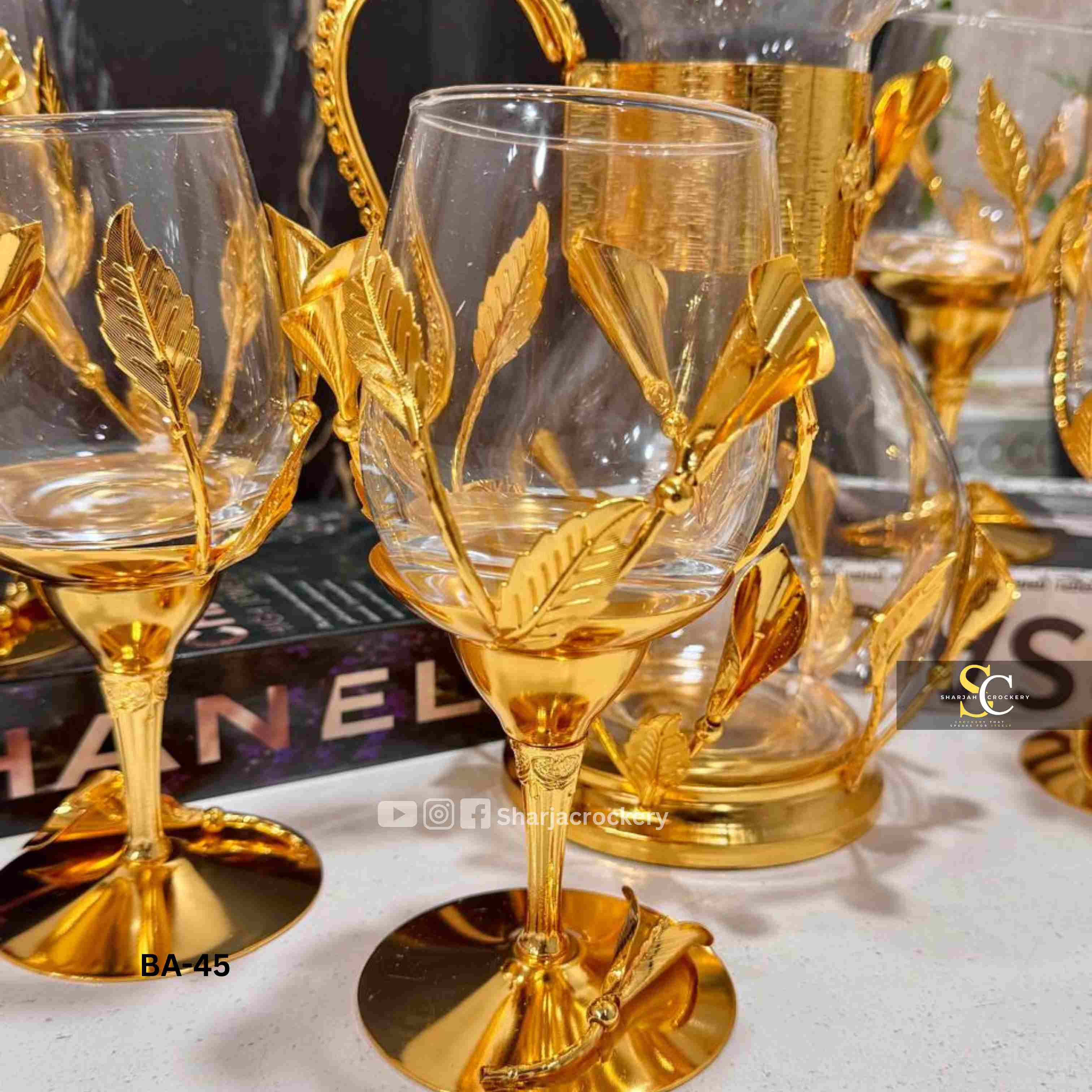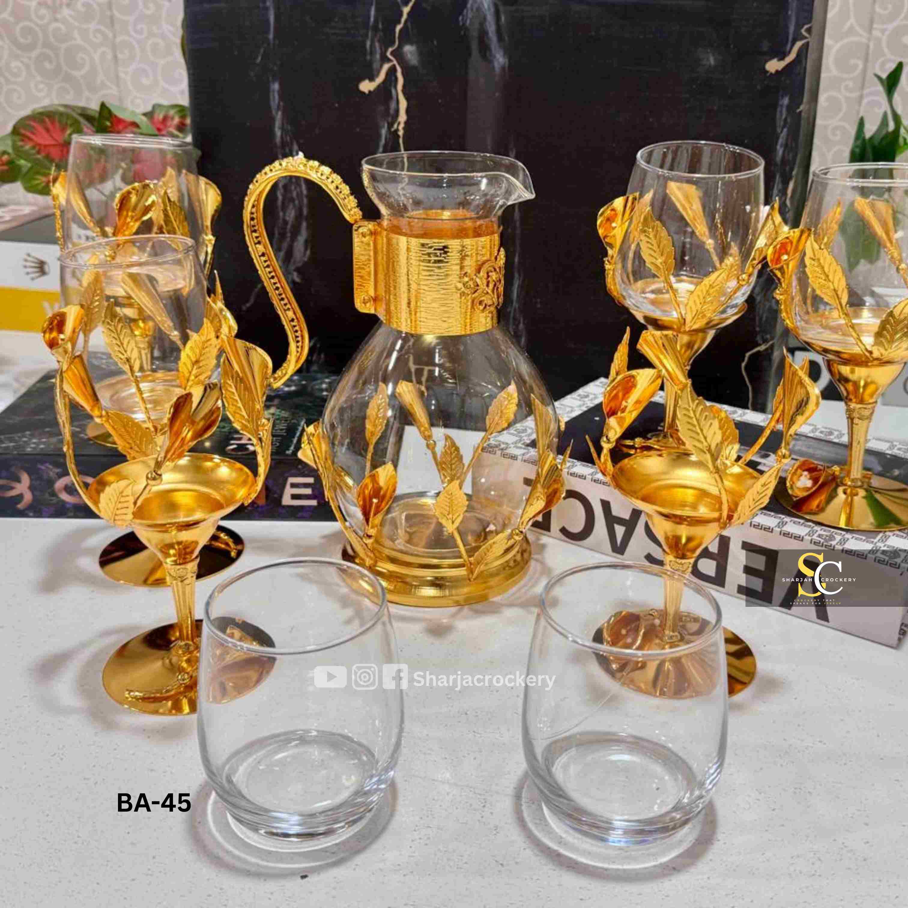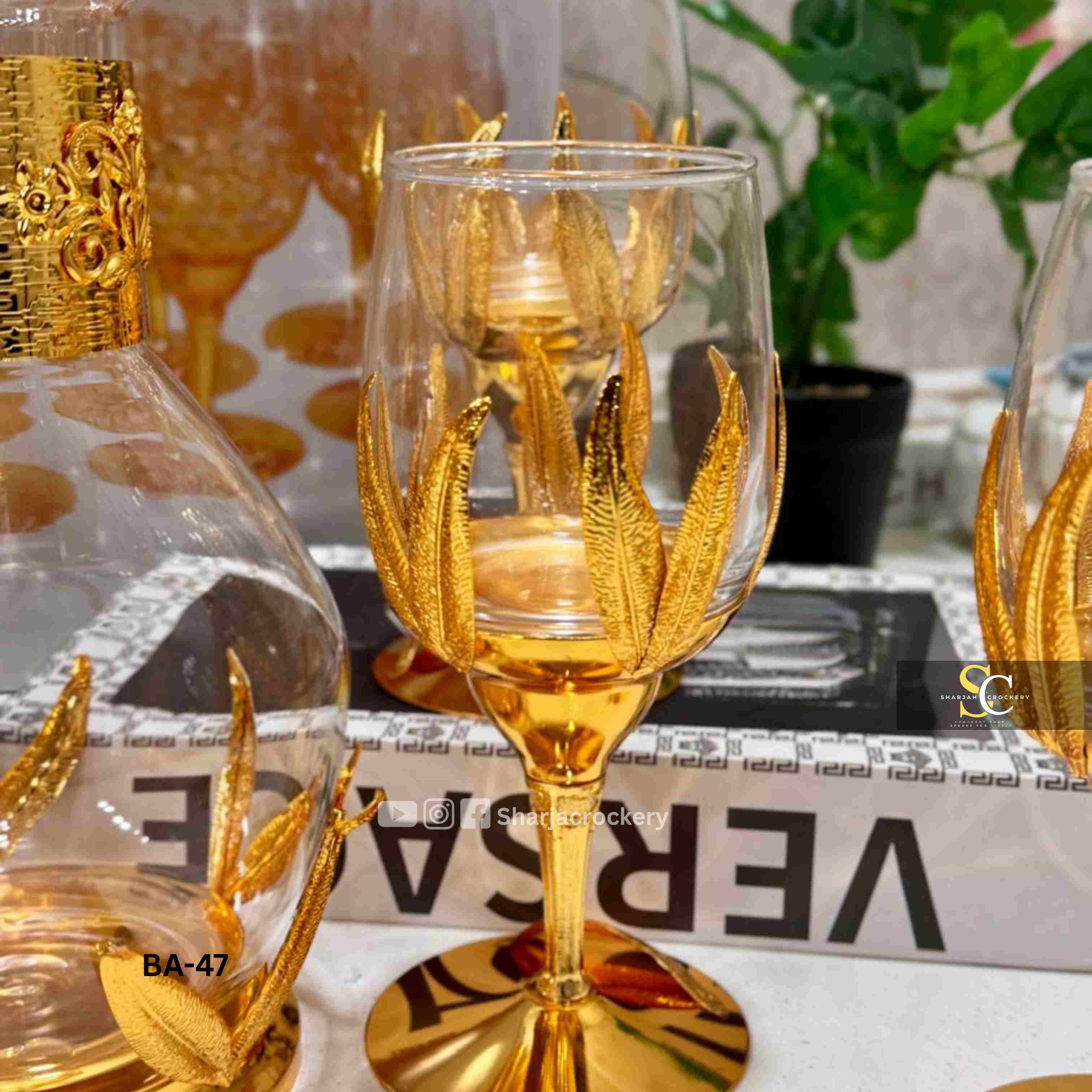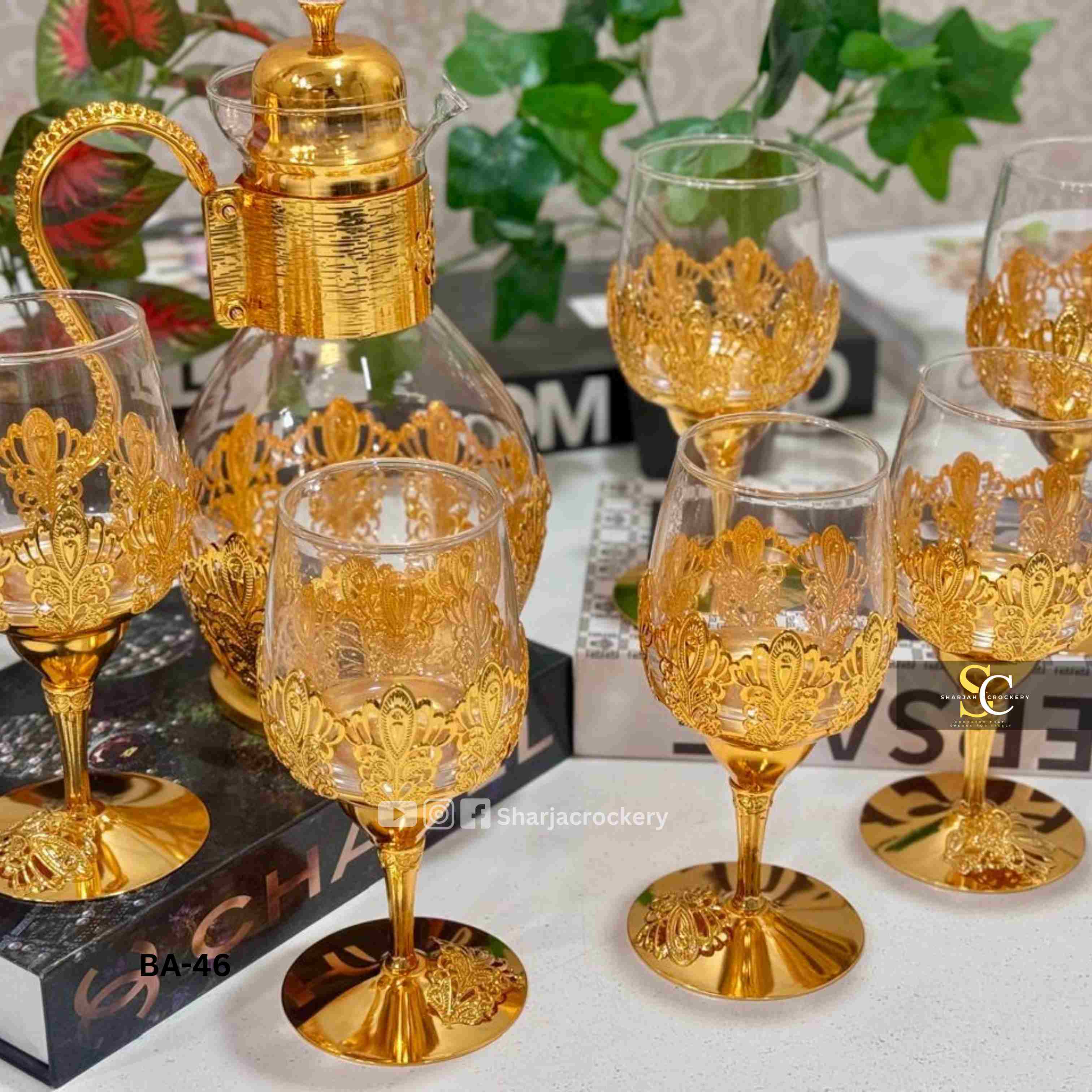 This premium collection features stunning, high-quality glass pitcher and glass sets (available in 7-piece and 9-piece configurations). Each set is lavishly adorned with opulent, intricate gold-plated designs, transforming simple serveware into a centerpiece of luxury.