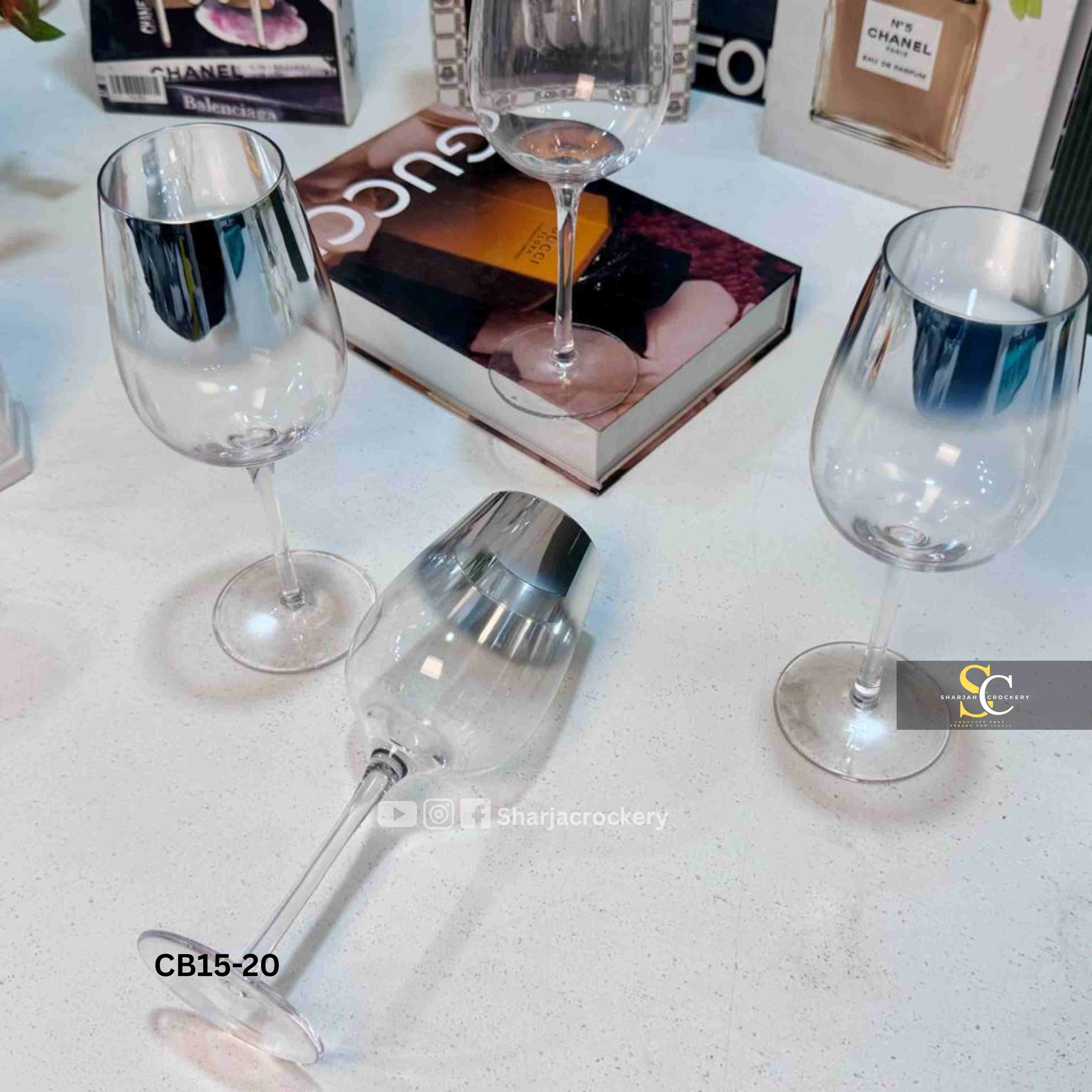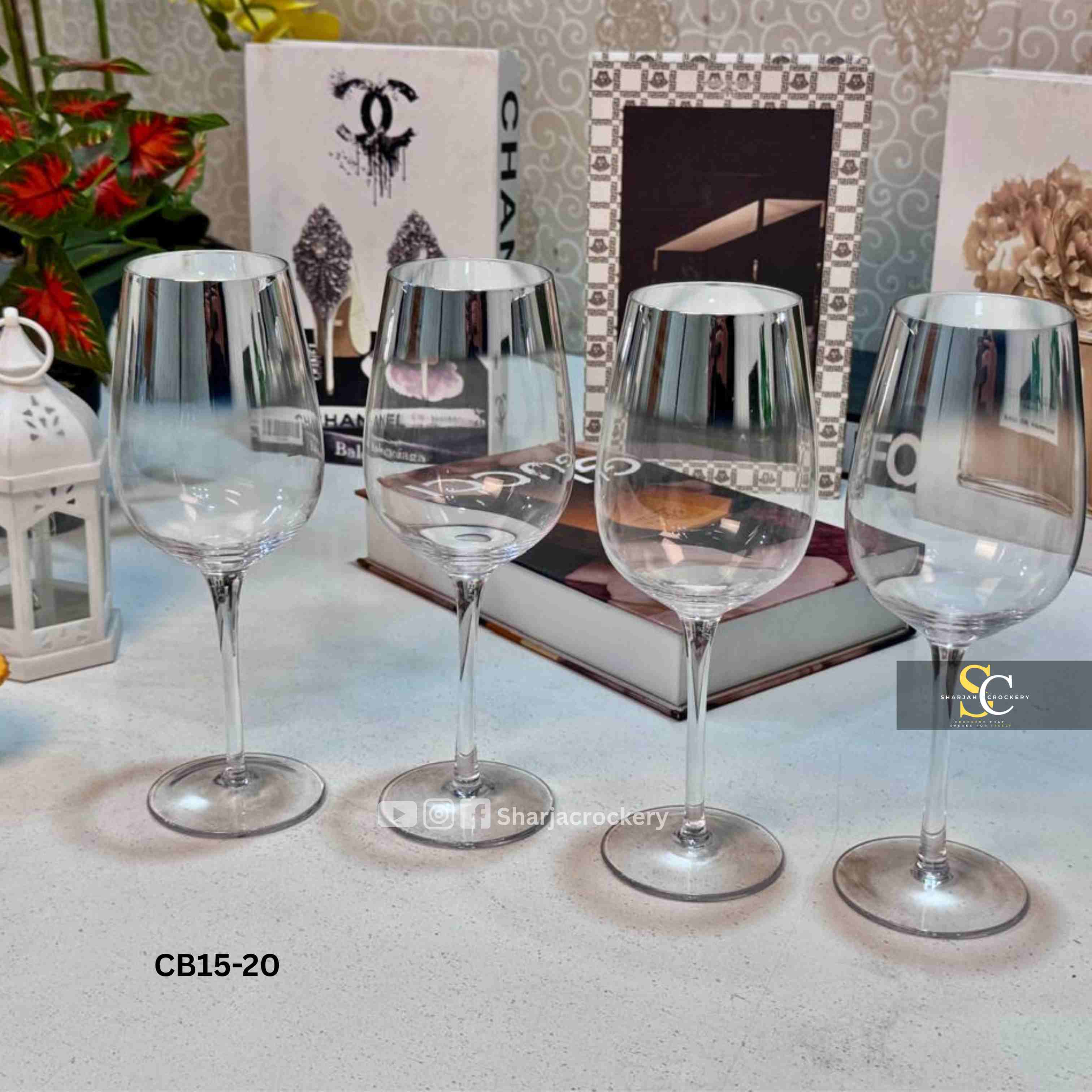 Introducing a modern twist on classic stemware. This Set of 4 Chrome Rimmed Glasses adds a touch of contemporary elegance and luxury to any table setting or home bar. Perfect for serving wine, cocktails, mocktails, or even stylish water service, these glasses are designed to impress your guests.
