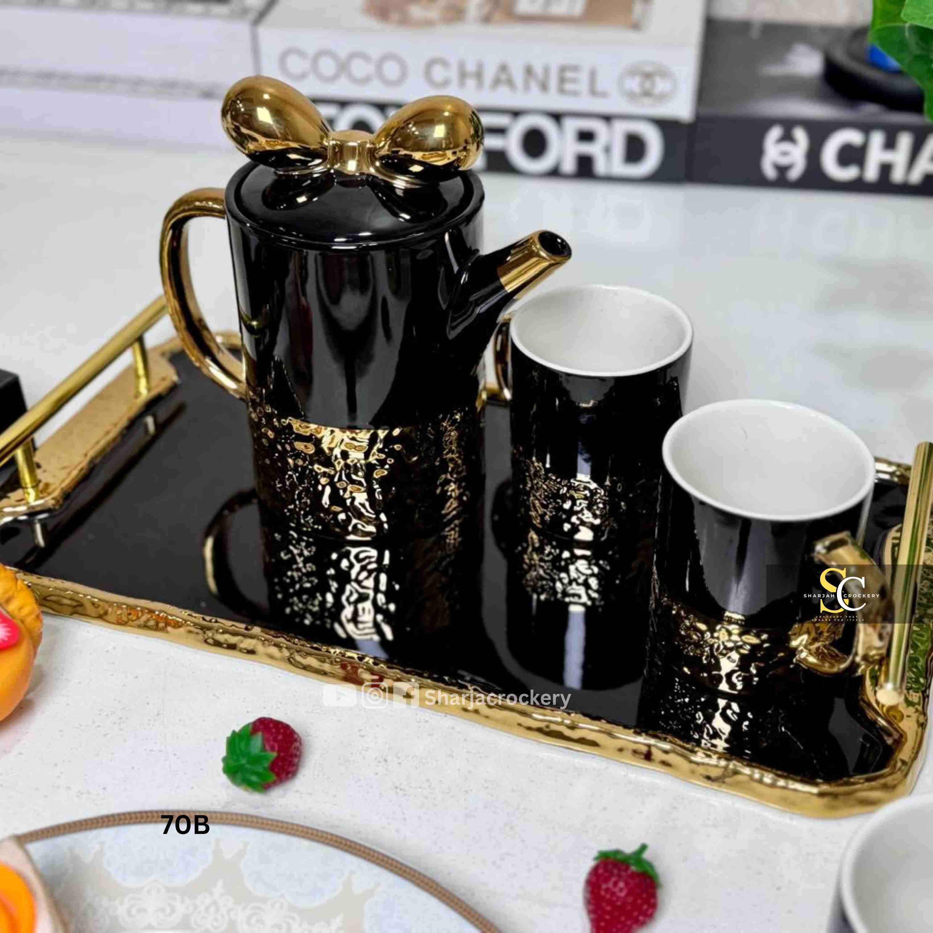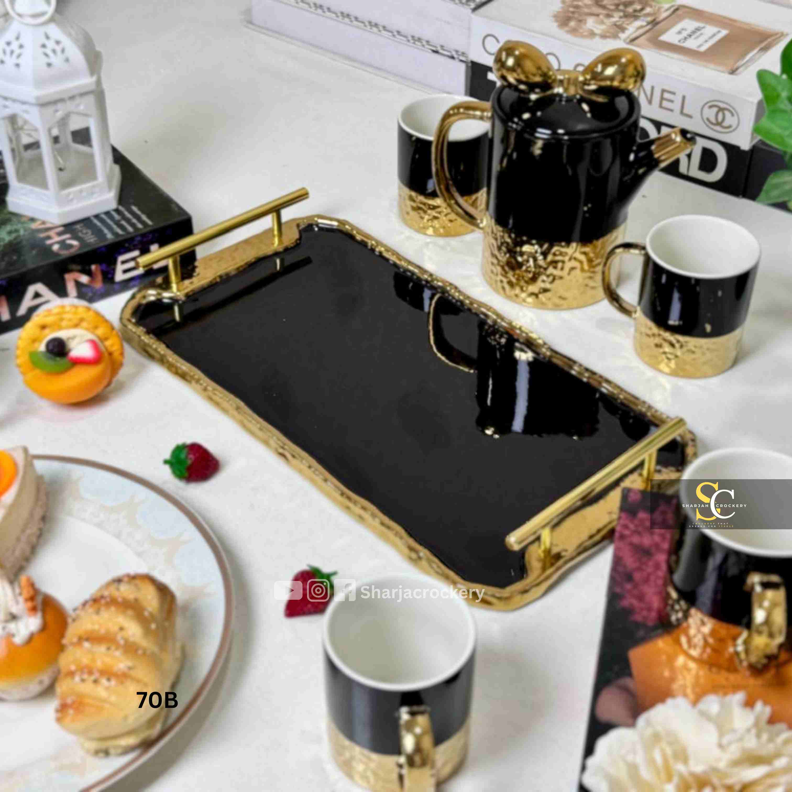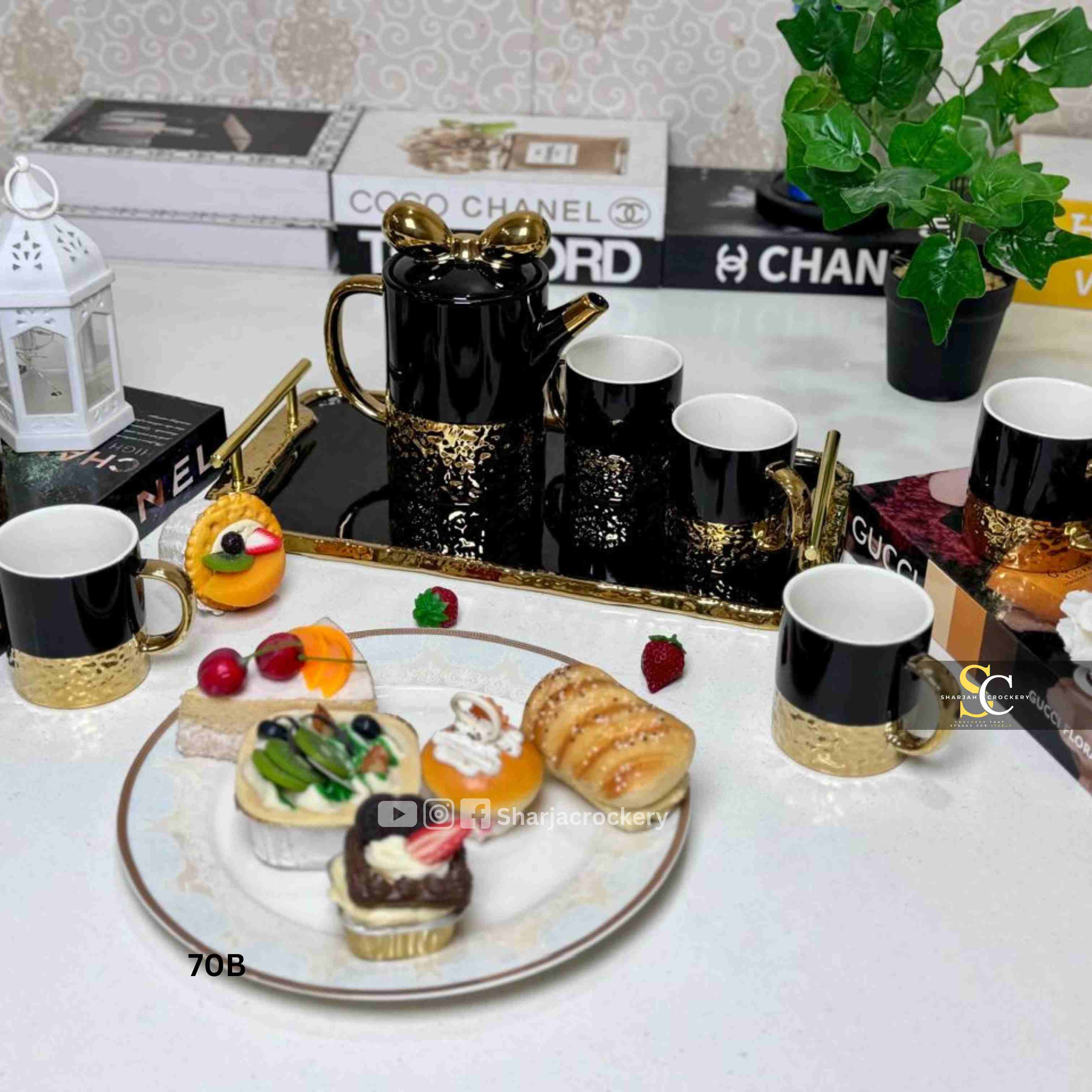 Modern Black & Gold Ceramic Coffee/Tea Set - Bow Lid, 6 Mugs & Tray