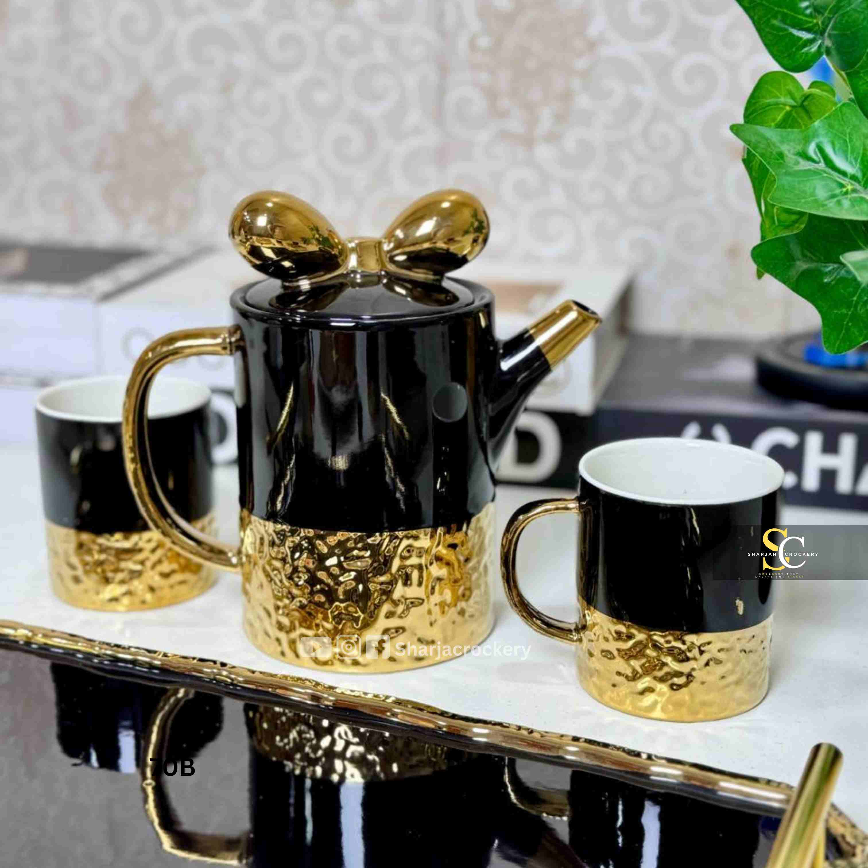 Modern Black & Gold Ceramic Coffee/Tea Set - Bow Lid, 6 Mugs & Tray Skip to content
