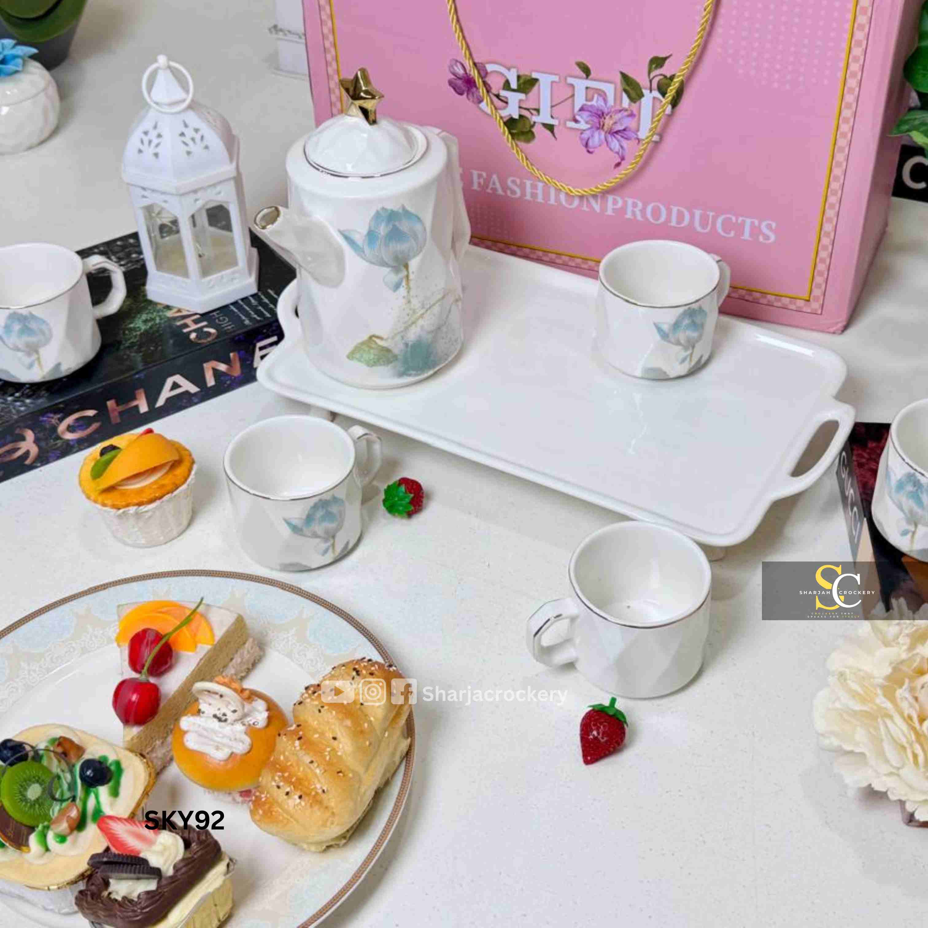 Elevate your tea or coffee service with the sophisticated charm of our 8-piece Modern Floral Serving Set. Blending contemporary geometric texture with a delicate blue floral pattern, this set is a beautiful addition to any home and a guaranteed conversation starter.
