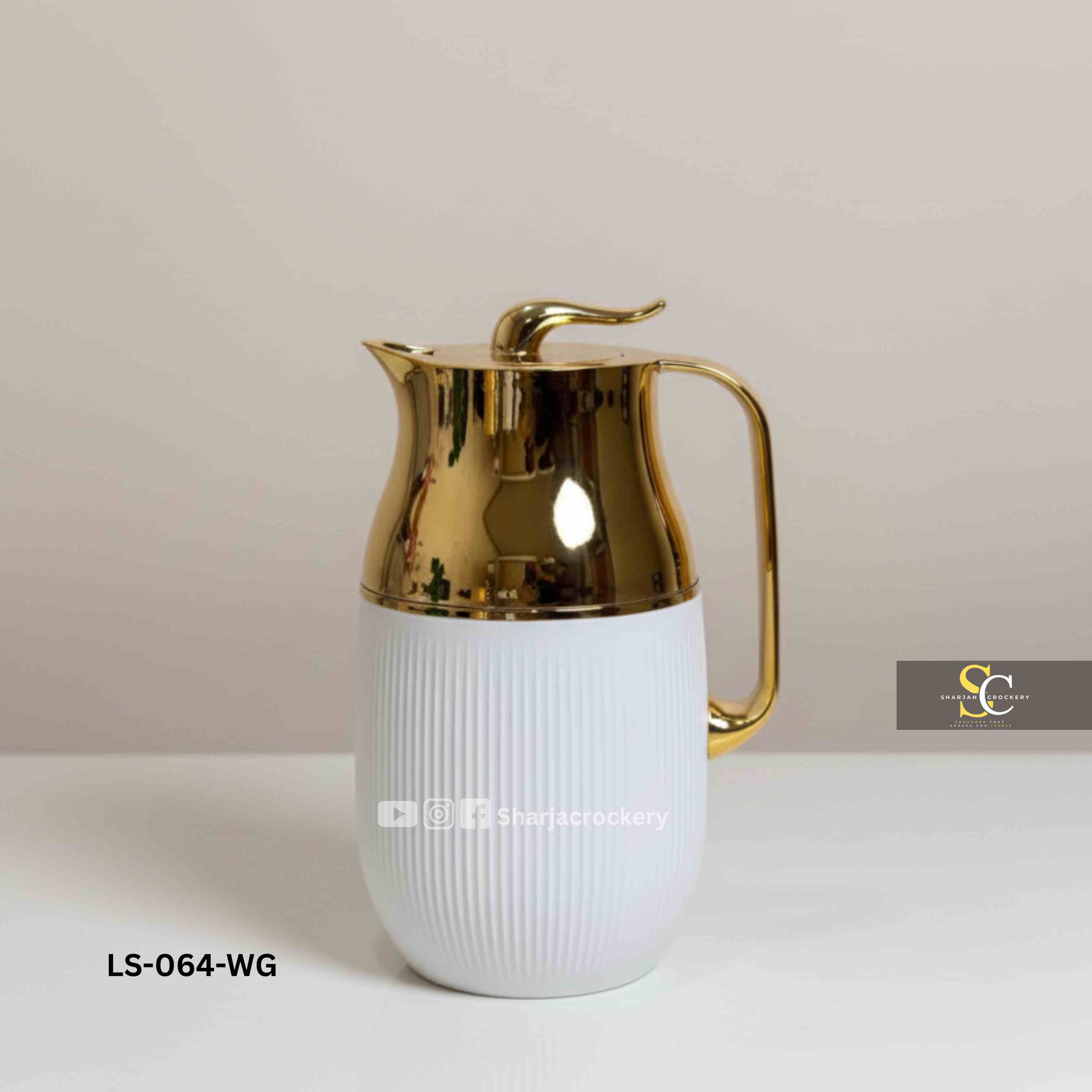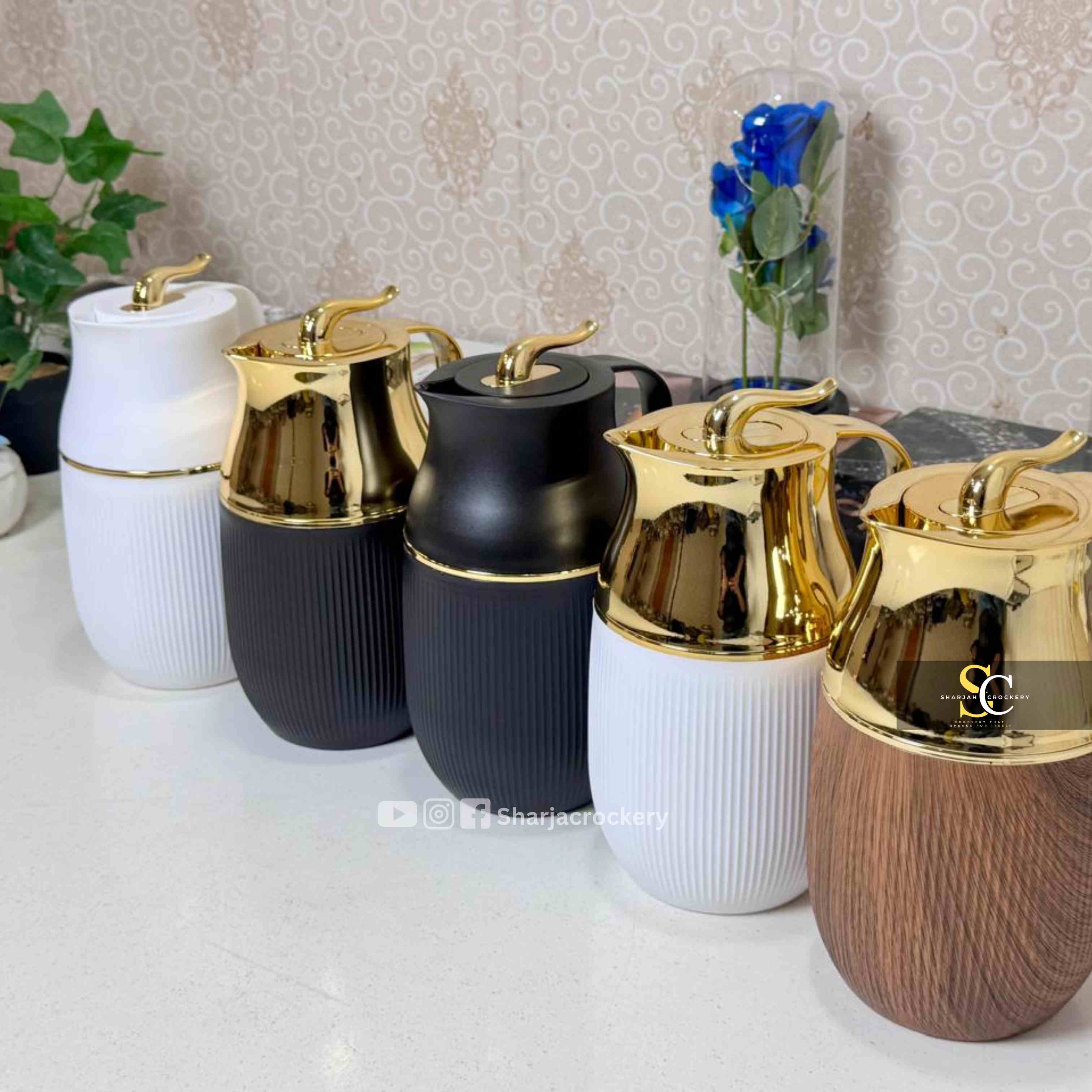 Elevate your serving style with our Premium Glass Vacuum Jug (1.0L) – available in 5 elegant designs. Crafted with a durable glass interior and a stylish golden lid, these jugs are perfect for keeping your beverages hot or cold for hours. The ribbed textured body not only adds a modern touch but also ensures a firm grip. Ideal for home, office, or gatherings, this vacuum jug combines functionality with luxury.