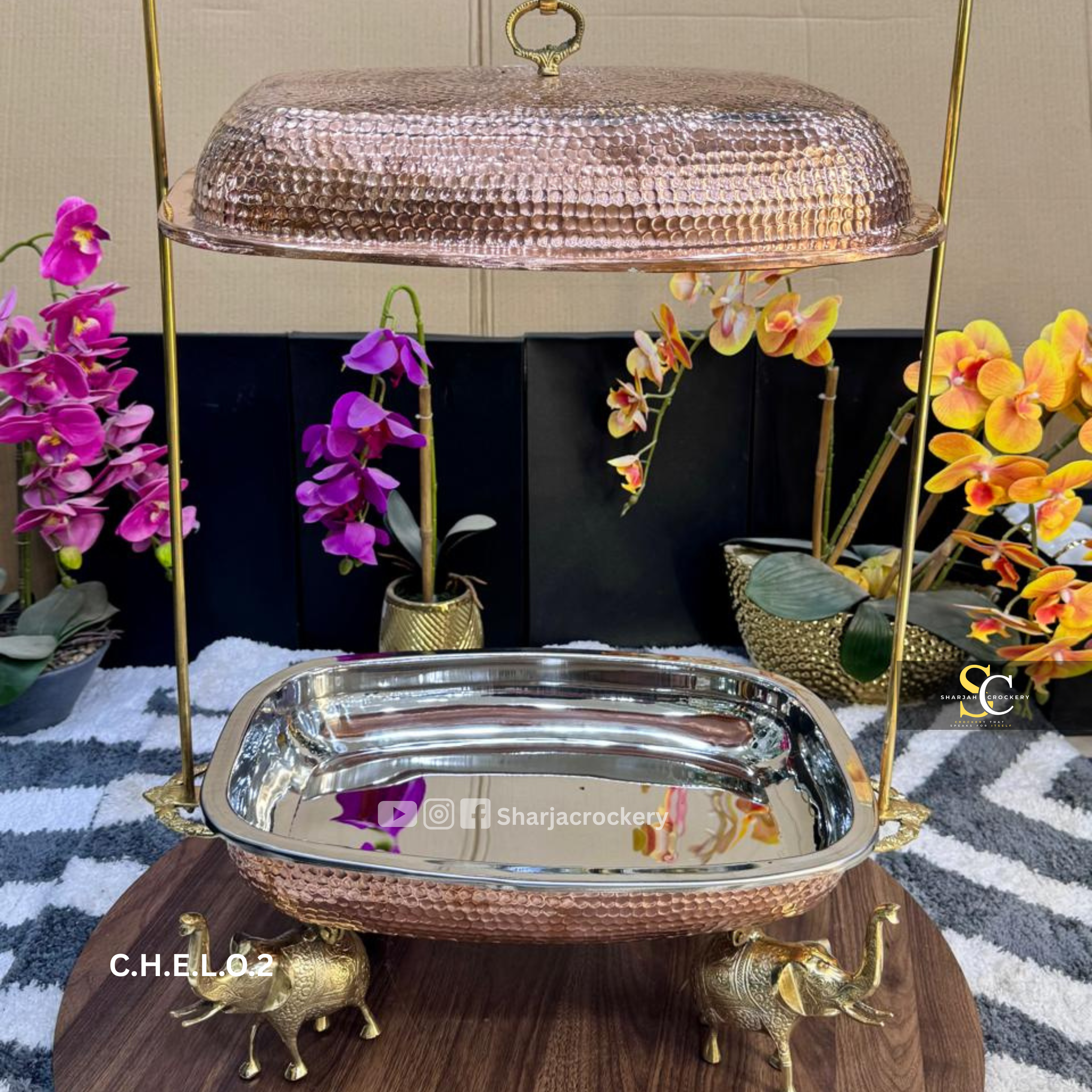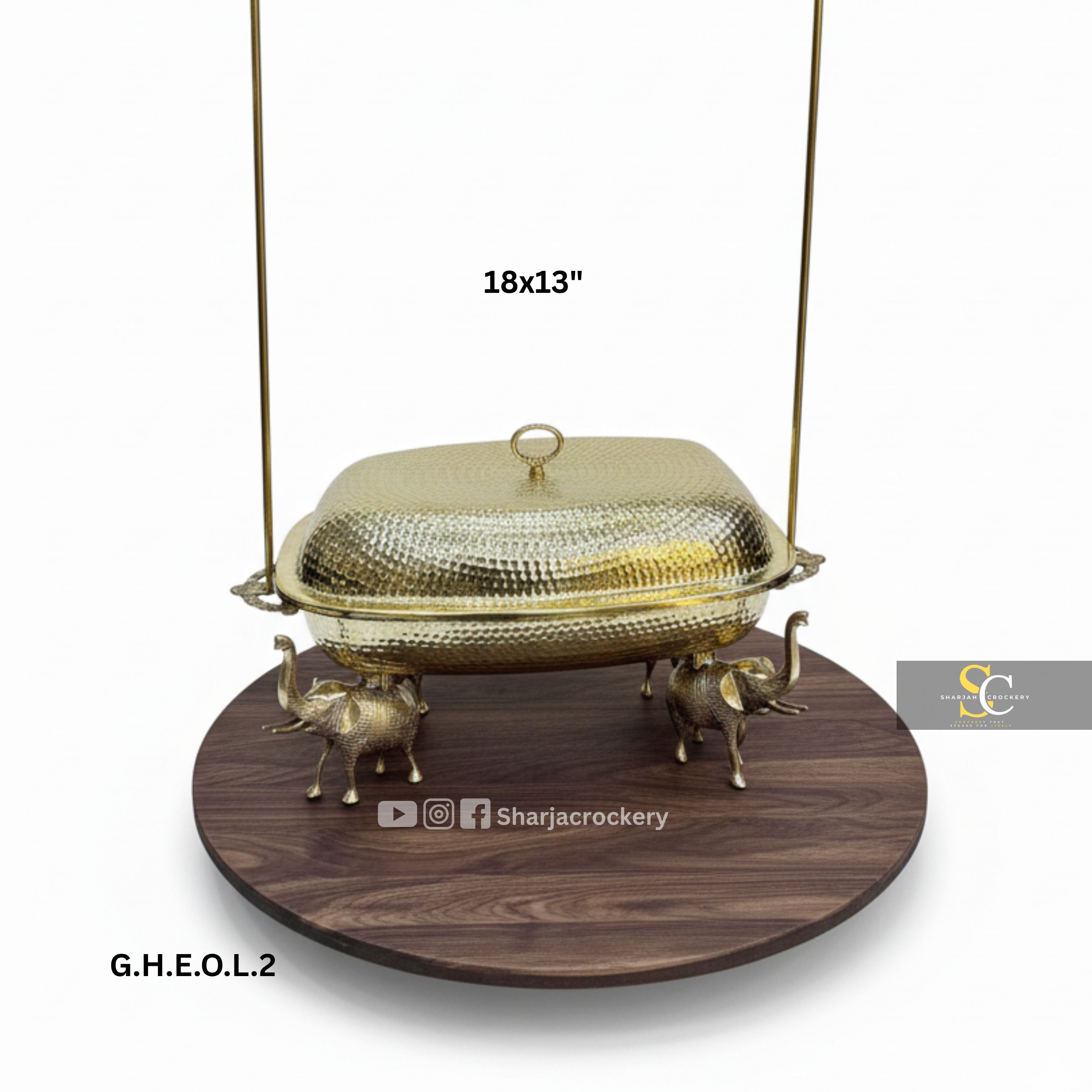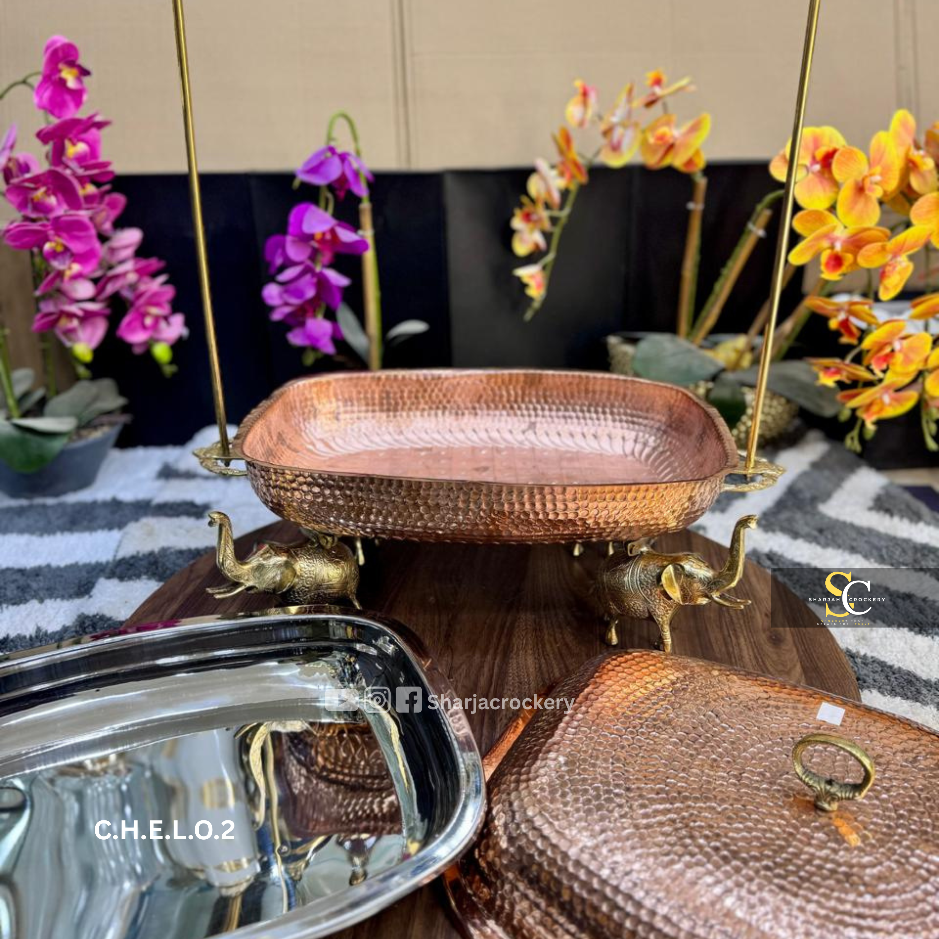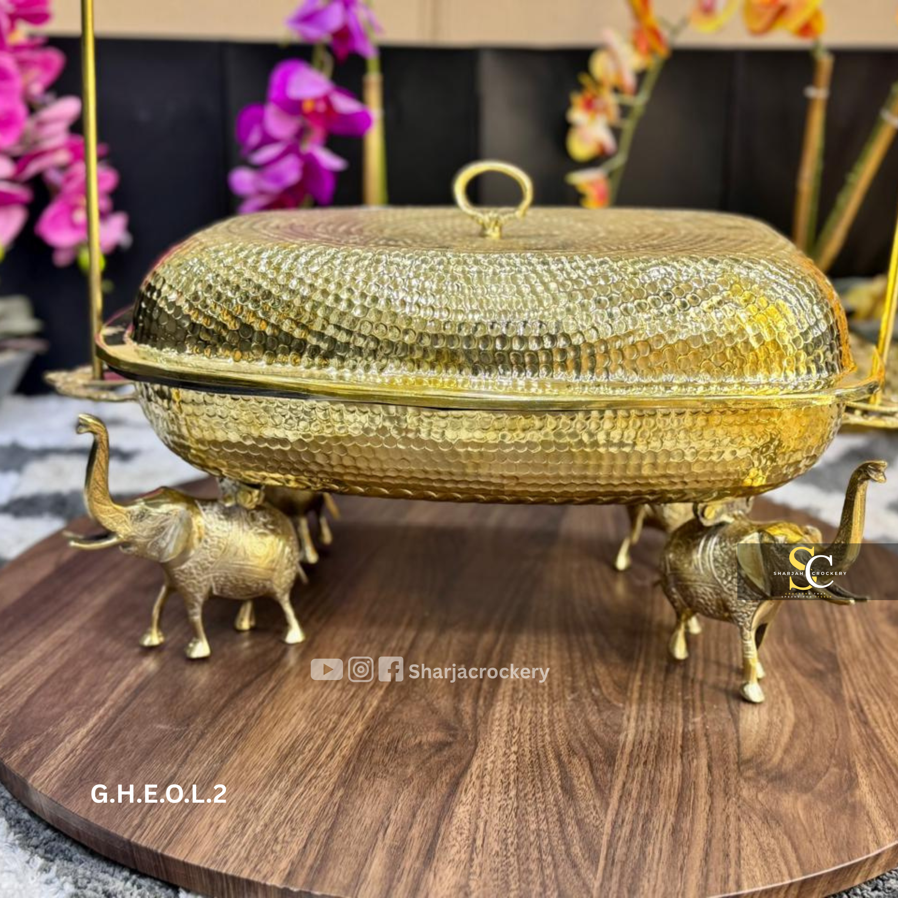 Each dish features a traditional, oblong design and rests upon a signature, ornate Brass Elephant Stand. This detailed elephant-foot base and the overhead lid-hanging frame ensure a royal presentation, turning any buffet into a grand event. Perfect for keeping food hot while adding an unmatched, luxurious aesthetic to weddings, banquets, and formal gatherings.